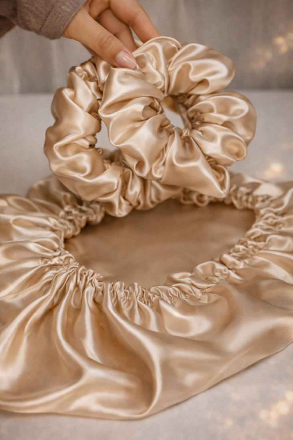 Confeccionados en satín suave y brillante, ideales para proteger tu cabello mientras duermes o complementas tu look. El gorro ayuda a reducir el frizz y mantener la hidratación.
